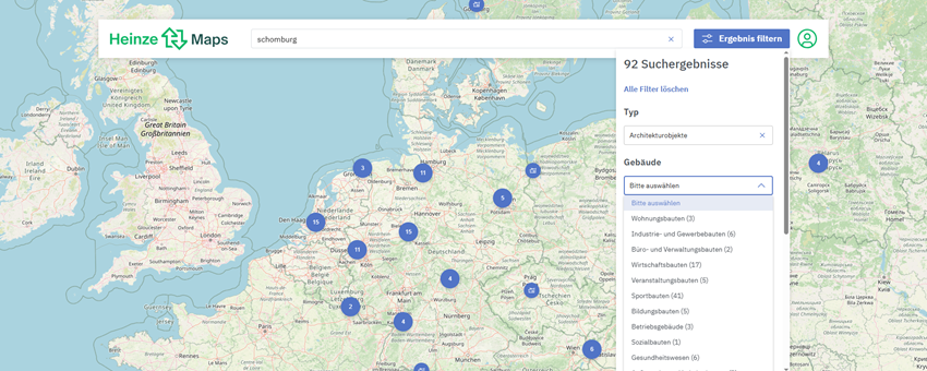 Während klassische Produktkataloge nur die technischen Merkmale darstellen können, zeigt Heinze Maps Ihre Produkte im realen Einsatz. Architekt:innen erkennen sofort, wie sich Ihre Materialien und Komponenten in verschiedenen architektonischen Konzepten bewähren und umsetzen lassen. - Regionale und internationale Reichweite